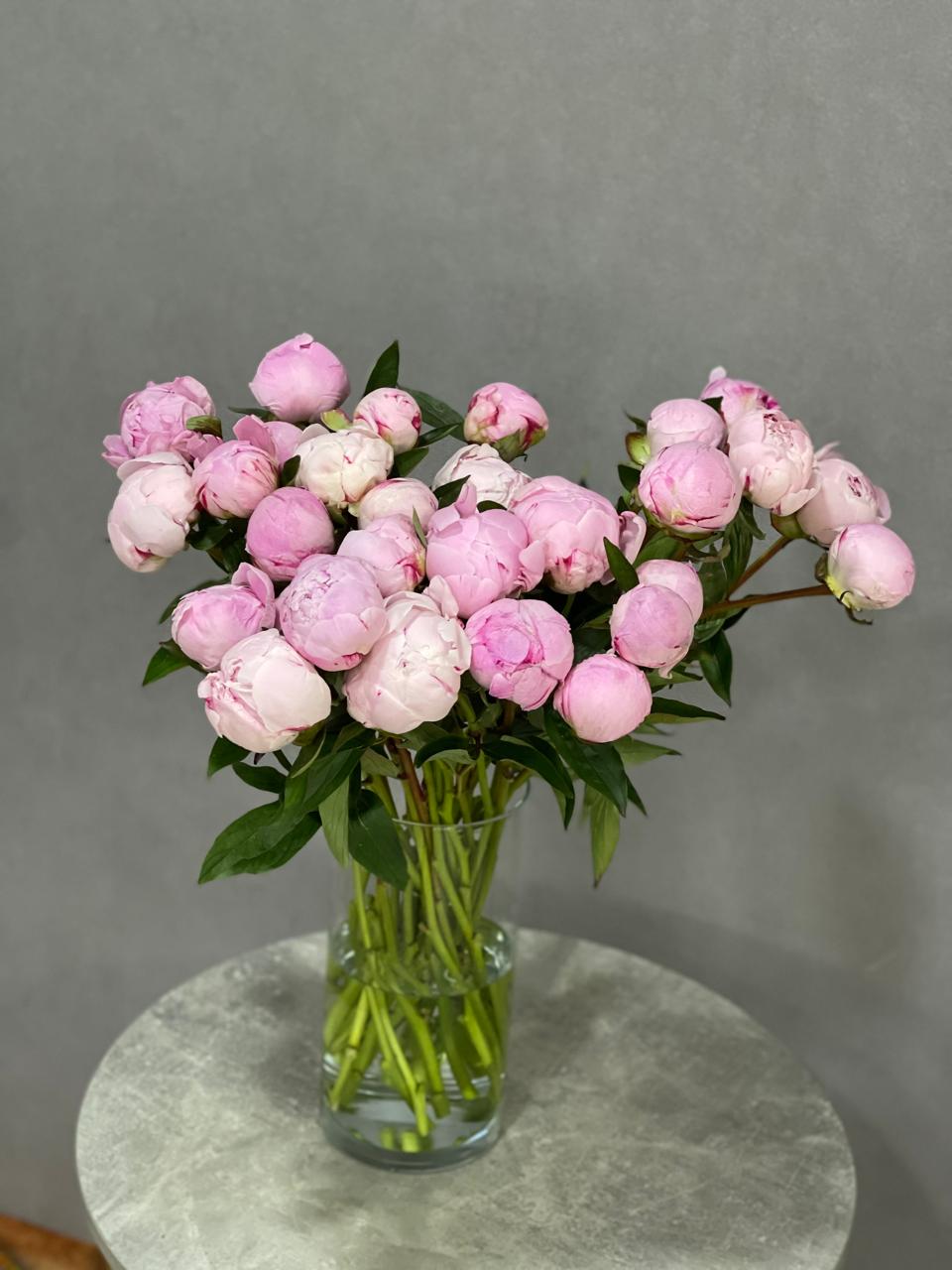 Так выглядят 29 пионов в вазе без упаковки. На фото пионы в закрытом и полураскрытом виде.